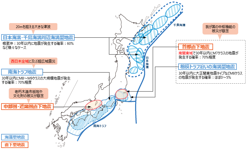 中でも、関東から九州の広い範囲で強い揺れと高い津波が発生するとされる南海トラフ地震と、首都中枢機能への影響が懸念される首都直下地震は、今後30年以内に発生する確率が70%と高い数字で予想されています。