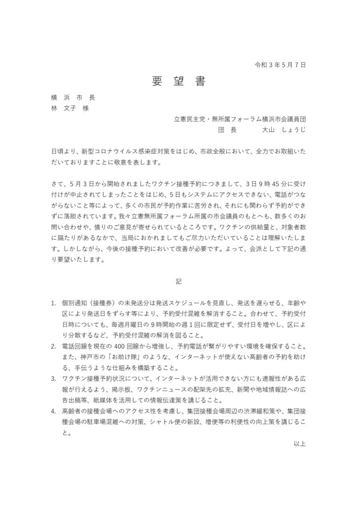 なお、先日発生した接種予約に関するトラブルおよび今後の接種について市長に要望書を提出いたしました。