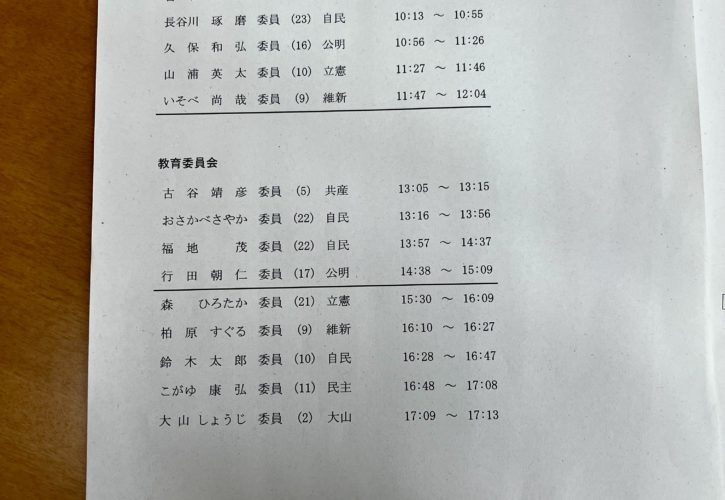 質問項目は中学校給食、教職員へのICT環境整備、ICT支援員の活用、教職員の働き方(特別支援学校教職員の働き方、空気の見える化PJ、日本スポーツ振興センター災害共済給付制度)、不登校支援、学校地域連携推進、学校施設の計画的な立て替えと教育環境整備、峯小学校コミュニティハウス、図書館ビジョン、その他教育委員会に関わる事業全般について質疑を行う予定です。