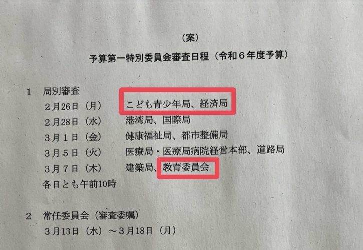 来週2/26から3/8までの間で令和6年度各所管局別の予算審議が開催されます。
