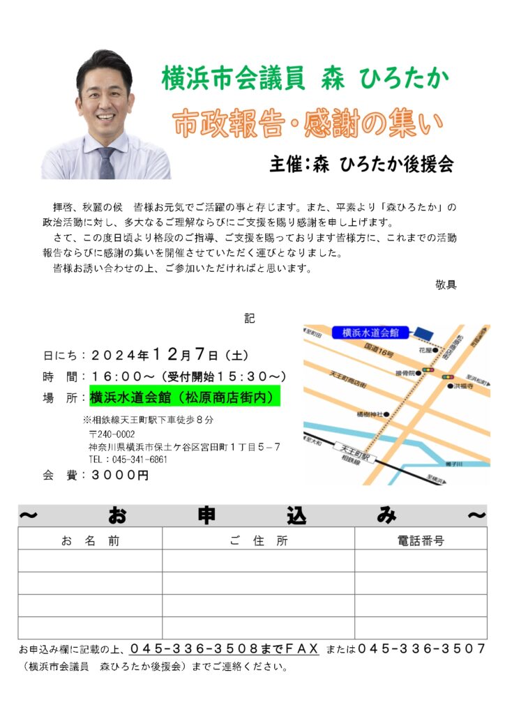 森ひろたか2024年市政報告・感謝の集いを開催! 2024 10/31 お知らせ お知らせ よかったらシェアしてね! あなたの一票が未来を決める! 「森ひろたか 市政レポート24−18」を発行いたしました! 関連記事 令和8年度予算要望書を提出!! 2025年10月23日 今年も開催します! 2025年10月8日 【緊急募集】動画編集スタッフ大大大募集! 2025年8月19日 来たる!泉健太代表! 2024年6月5日 森ひろたか市政報告&感謝の集い2023を開催します! 2023年10月22日 YouTubeチャンネルを開設いたしました! 2023年3月1日 区民の声を山中市長に!予算要望いたしました! 2022年9月21日 【お詫びとお知らせ】 2021年8月3日