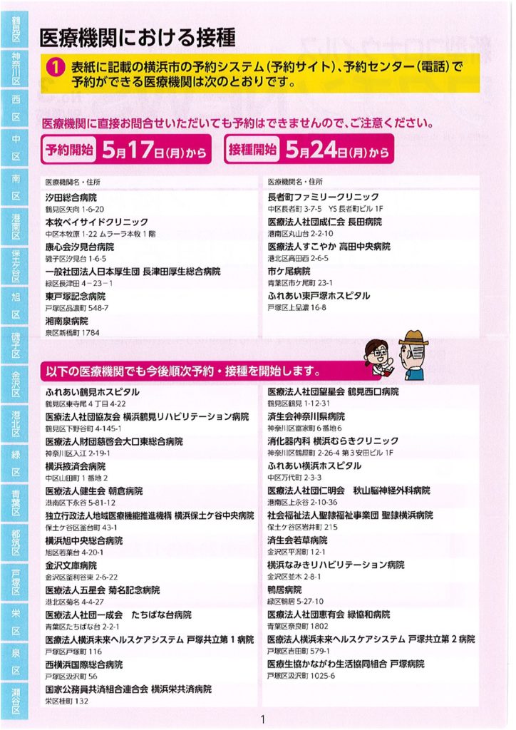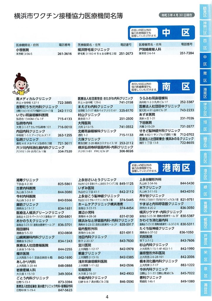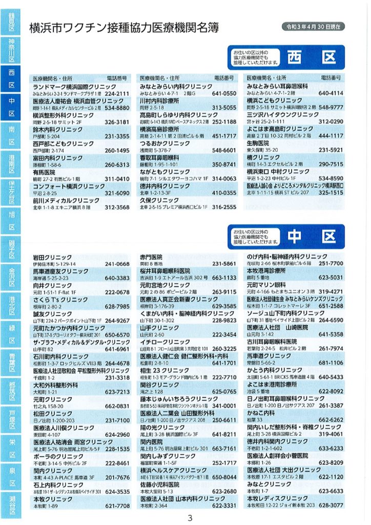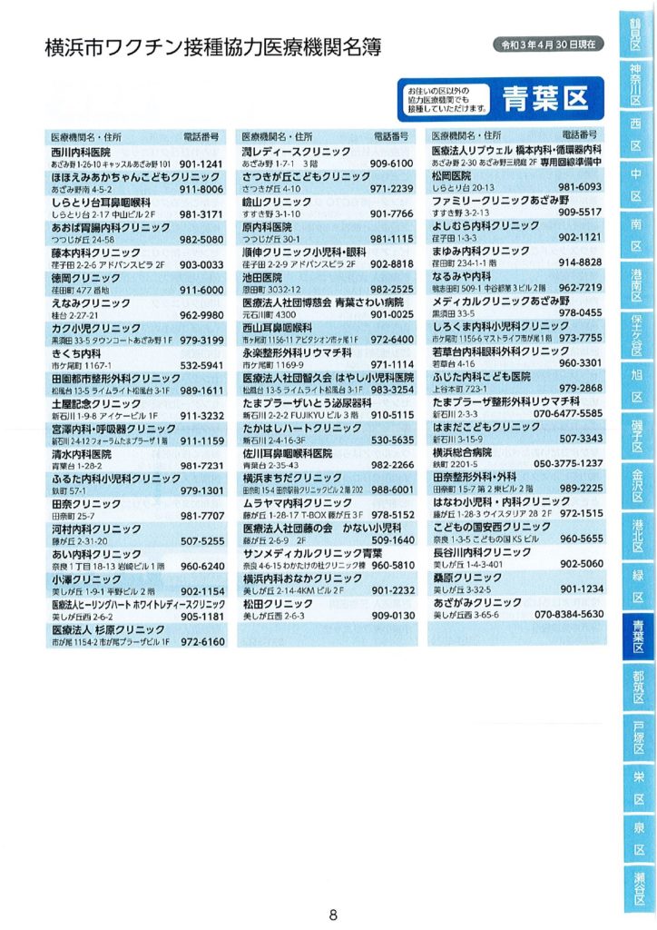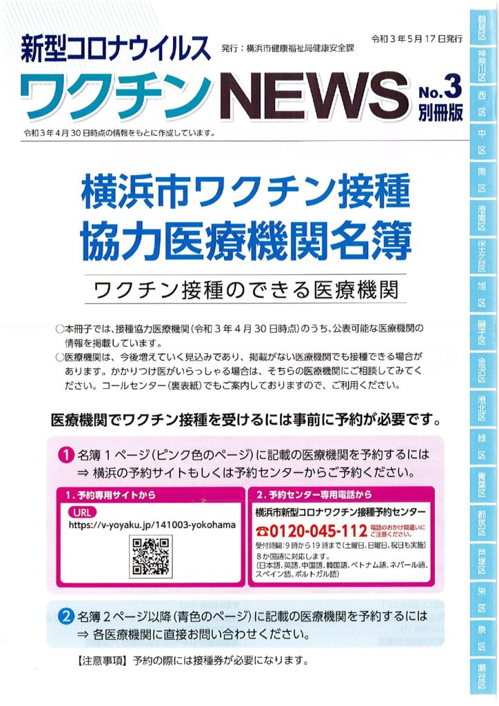 ワクチン接種における協力医療機関が公表されました。 2021 5/17 活動ブログ 本日横浜市ワクチン接種における協力医療機関の一部が示されました。 本冊子では、現段階公表可能な医療機関のみ記載されています。 区役所・地区センター・ケアプラザ等で配布されますので、是非お手に取っていただき、ご確認ください。 活動ブログ よかったらシェアしてね! 円滑なワクチン接種を! ワクチン予約にあたっての注意点 関連記事 噛み具合はご容赦ください! 2026年2月17日 急ピッチで代表質問準備!? 2026年2月15日 支持率が高いうちに逃げきれ解散!? 2026年1月13日 二十歳を迎えた皆さまへ 2026年1月12日 未来に向けて! 2026年1月10日 賀詞交換会 2026年1月4日 2026年がスタート🎍 2026年1月1日 🚨年末年始消防特別警戒🚨 2025年12月29日