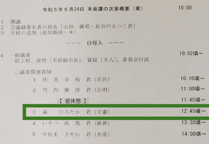 当初予定は11時30分頃でしたが、議事日程の関係から昼休憩後の12時45分頃の登壇となります。