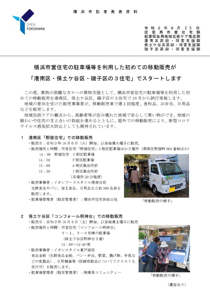 先日(9/8)の本会議一般質問時に、議論・提案をさせていただいた「公共建築物等を活用した買い物弱者支援(移動販売場所の拡充)」について、早速保土ケ谷区・港南区・磯子区の三区で試験的に実施されることとなりました!