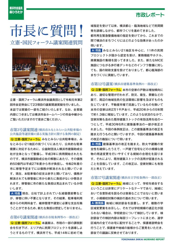 地域の皆さまに少しでも横浜市会の活動や取り組み内容等についてご一読いただきたいと思い「森ひろたか市政レポート」を作成いたしました。