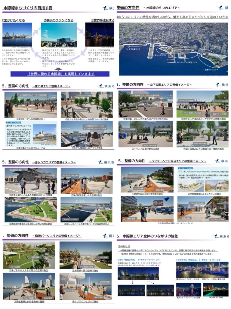 また今回の水際線の素案計画にはみなとみらい汽車道やランドマーク周辺の海沿いや市役所下の大岡川沿いの活用は含まれていないことから引き続き横浜の魅力向上に向け積極的に具体提案していきます!